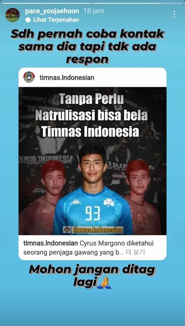 "Sudah pernah coba kontak sama dia (Cyrus) tapi tidak ada respon. Mohon jangan di-tag lagi," tulis Yoo yang selama aktif mengenakan sarung tangan identik dengan sejumlah kesebelasan Liga 1 dari Papua, Persipura Jayapura, itu.