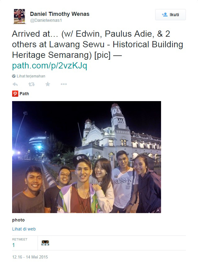 "Arrived at Semarang after 12 hours drive from Jakarta," ungkap Daniel di akun Path-nya.