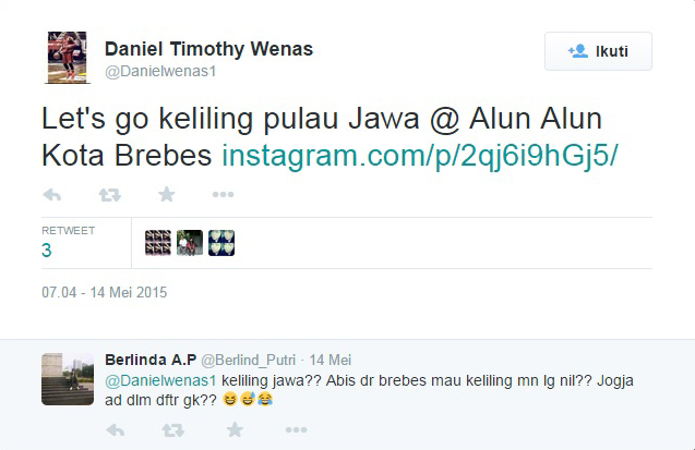 "Let's go keliling pulau Jawa @Alun Alun Kota Brebes," Seperti update di akun Twitter @Danielwenas1.
