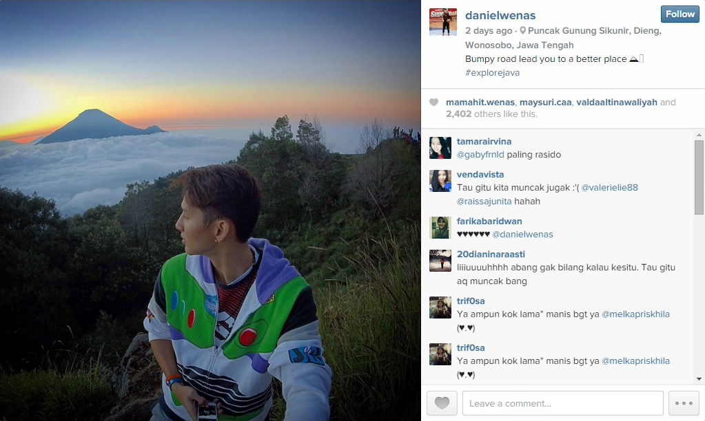 Saat ini Daniel sedang berada di Puncak Gunung Sikunir, Dieng, Wonosobo dengan membagikan kebahagiaannya menyelusuri Pulau Jawa lewat foto-foto di jejaring sosial medianya.