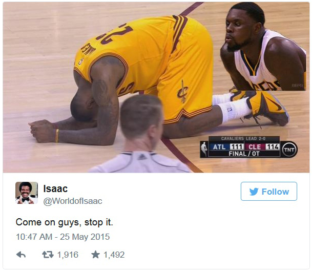 Sayang, gestur kelelahan yang ditunjukkan LeBron setelah pertandingan menjadi bahan lelucon di dunia maya. Berikut foto-foto meme atau foto lelucon dari LeBron: