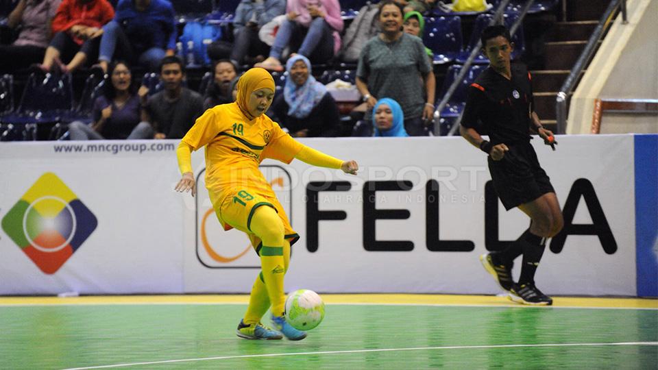 Gol Maya. Maya Muharina dari tim futsal UNJ berhasil memasukkan bola ke gawang Felda United Malaysia.