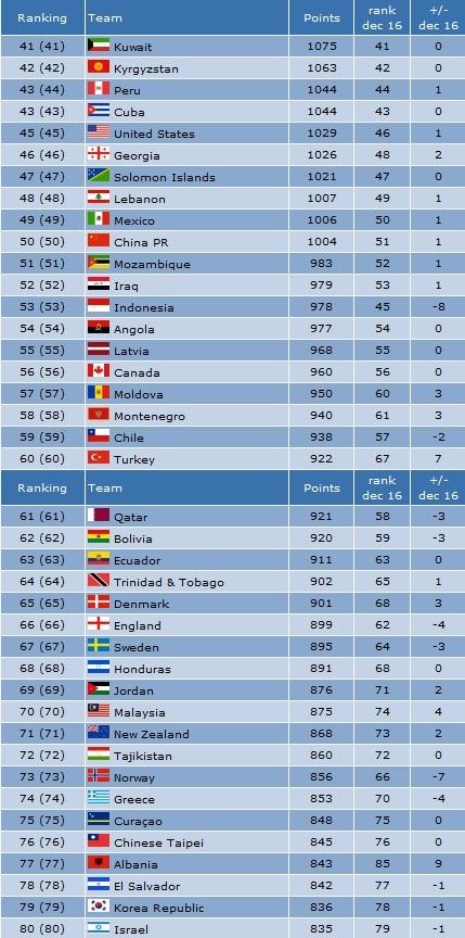 Timnas Futsal Indonesia berada pada ranking yang lebih baik dari Inggris dan Chile.Chile, saat ini tengah berada di posisi 59, berhasil mengumpulkan 938 poin dan harus turun 2 peringkat dari bulan Desember 2016 silam. Sedangkan Inggris peringkat mereka kembali anjlok dengan turun 4 peringkat dan menduduki posisi 66 dalam tabel ranking futsal dunia.