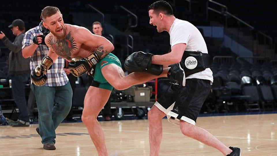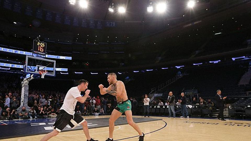 Conor McGregor melakukan latihan dalam aksi promosi jelang pertandingan NBA.