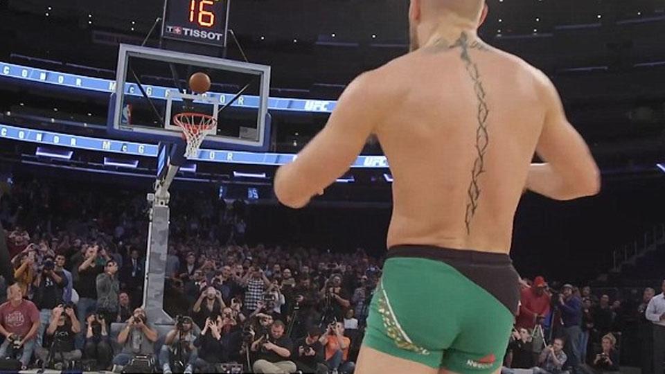 Conor McGregor mencoba bermain basket dihadapan para penggemarnya.