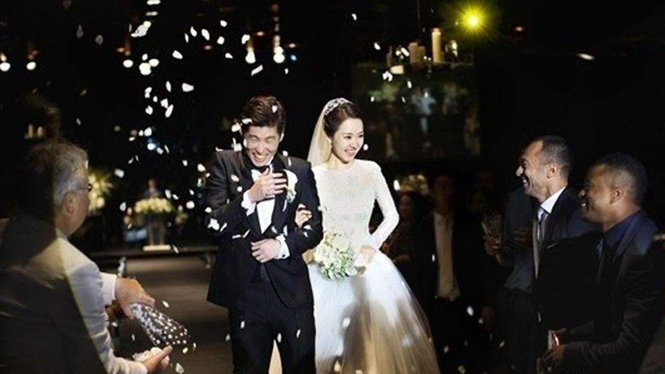 Park Ji Sung dan Kim Min Ji saat resepsi pernikahan.
