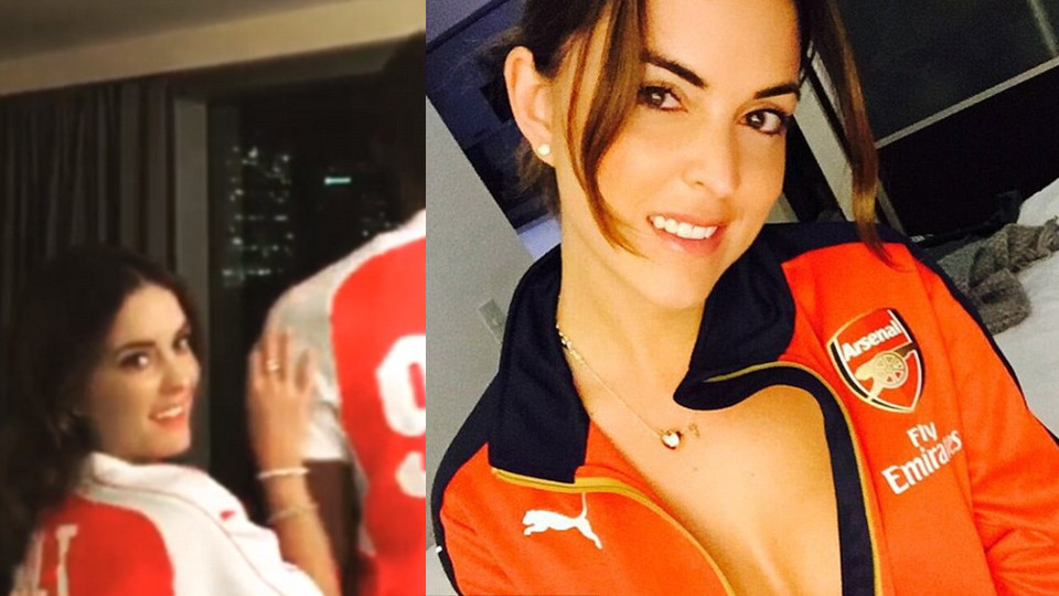 Usain Bolt tampak pasrah harus mengenakan jersey Arsenal setelah kalah taruhan dengan bintang TV Meksiko, Patty Lopez de la Cerda. Bolt dan Patty terlibat dalam taruhan saat laga Arsenal vs Manchester United di Liga Primer Inggris akhir pekan kemarin.