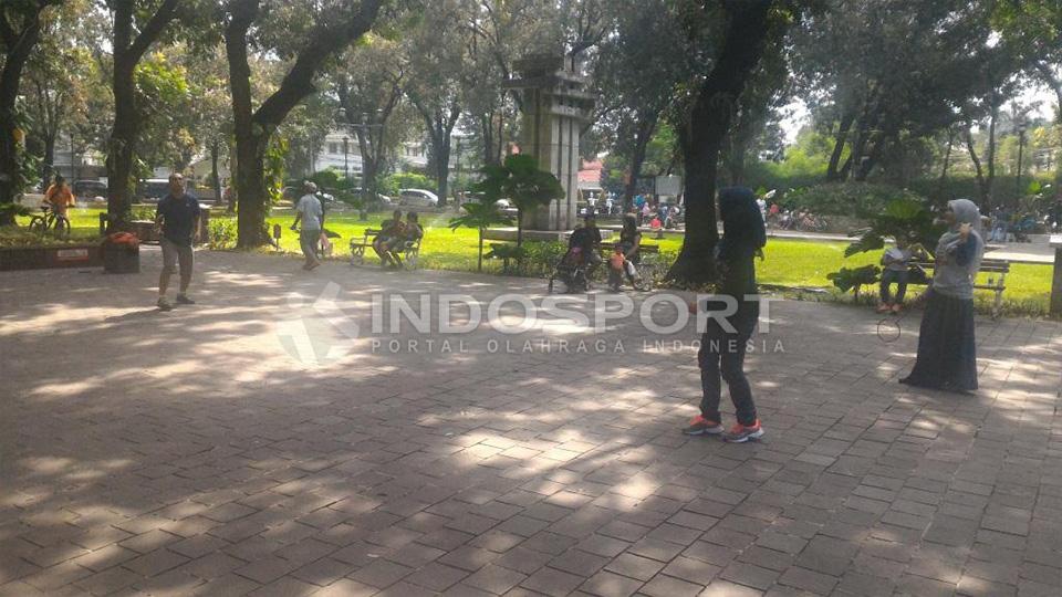 Kumpulan kerabat yang sedang bermain bulutangkis di Taman Suropati.