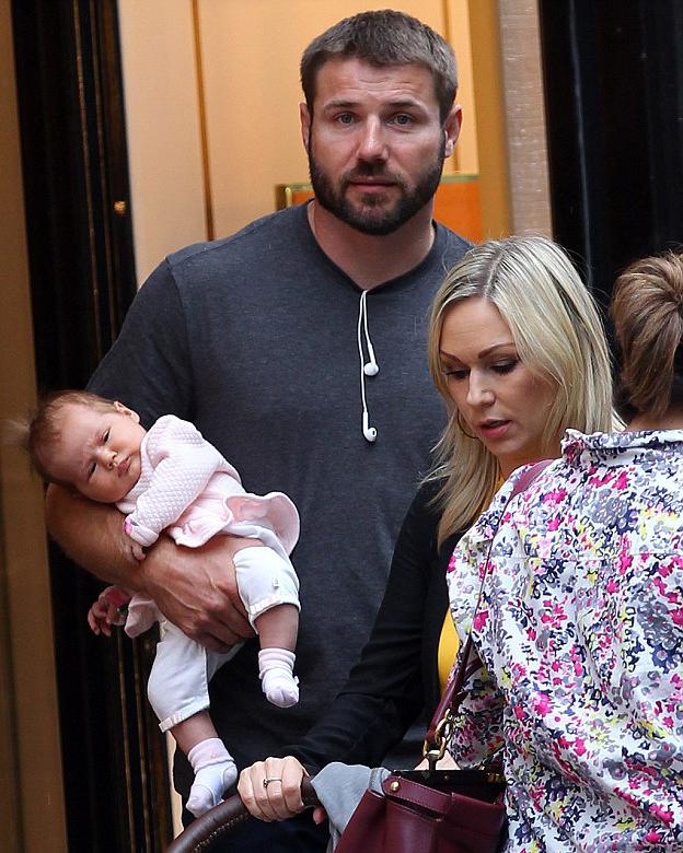 Mantan pemain Sale Sharks itu terlihat lebih senang menggenggam bayi perempuan di bawah lengannya daripada mendorongnya dengan baby stroller.