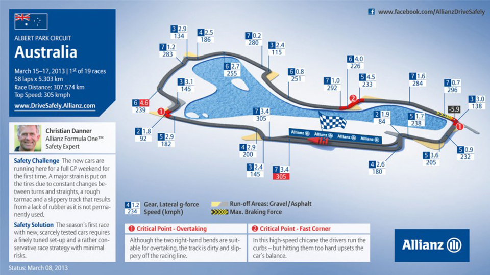 Formula 1 musim 2015 akan dihelat di Sirkuit Albert Park, Australia, Minggu 15 Maret 2015. Di musim lalu, pebalap asal Jerman, Nico Rosberg jadi yang tercepat di Albert Park. Pebalap Mercedes itu mencatatkan waktu 1 jam 32 menit 58 detik kala itu.