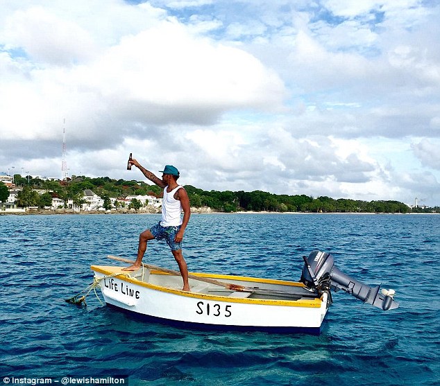 Menikmati laut lepas diatas sebuah perahu bermotor, pembalap Inggris itu menikmati sebotol bir sambil berdiri di atas 'kapal pesiar'nya.