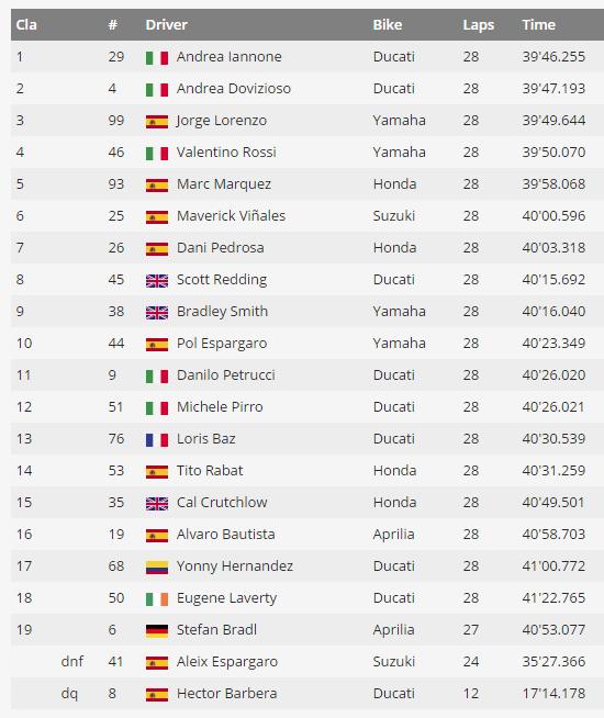 Hingga akhir balapan, Iannone dan Dovizioso berhasil mengamankan posisi mereka. Nama pertama berhasil finis di dan merebut podium teratas, diikuti oleh Dovi di urutan kedua. Sedangkan di tempat ke tiga di isi oleh Lorenzo.