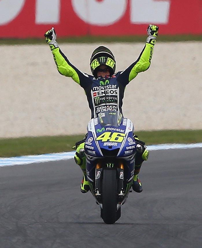 Valentino Rossi merayakan keberhasilan naik podium di Inggris.