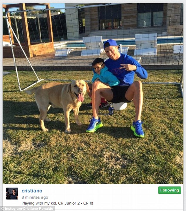 Sebuah gambar yang diunggah pemain terbaik dunia itu di jejaring sosial memperlihatkan keakrabannya dengan sang putra. Ronaldo dan Cristiano Jr terlihat santai di sebuah lapangan bola mini ditemani seekor anjing kesayangan.