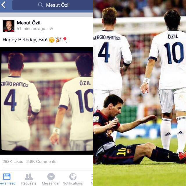 Bek Real Madrid, Sergio Ramos, yang lahir pada 30 Maret 1986 silam merayakan hari jadinya yang ke 29 dan mantan rekannya di Los Blancos, Mesut Ozil yang kini memperkuat Arsenal pun mengucapkan selamat via Twitter pribadinya, @MesutOzil1088, dengan cara mengunggah foto mereka di satu laga klub ibukota Spanyol itu.
