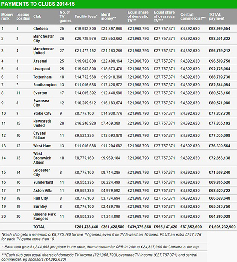 Manchester United tercatat mendapat uang sebesar 96 juta poundsterling. Sementara Arsenal hanya terpaut 249.454 poundsterling dari Manchester United. Manchester City yang berada di peringkat kedua, memperoleh total pemasukan sebesar 98 juta poundsterling.