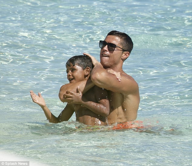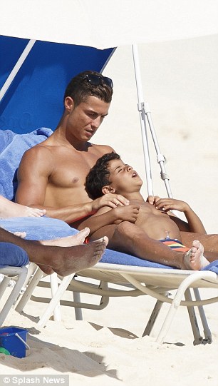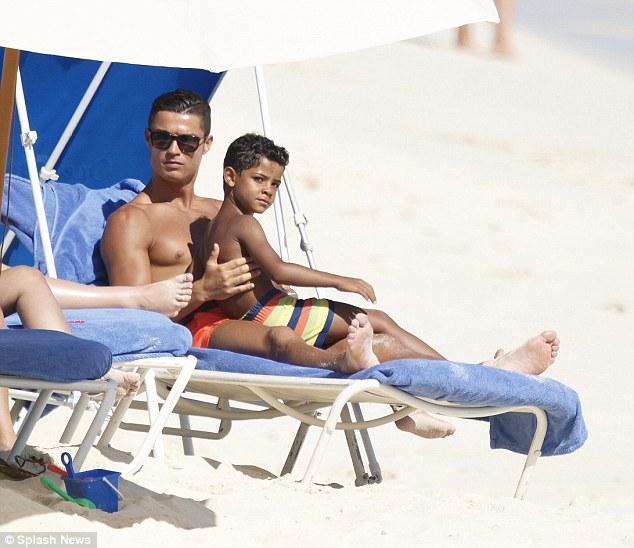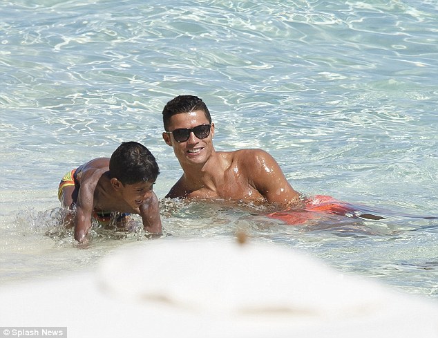 Ronaldo, yang mengenakan kacamata hitam, sangat menikmati berbaring di kursi. Tapi tidak dengan Cristiano Jr yang tak memakai kacamata. Saat berjemur, Ronaldo menutupi mata Cristiano Jr dengan menggunakan tangannya.