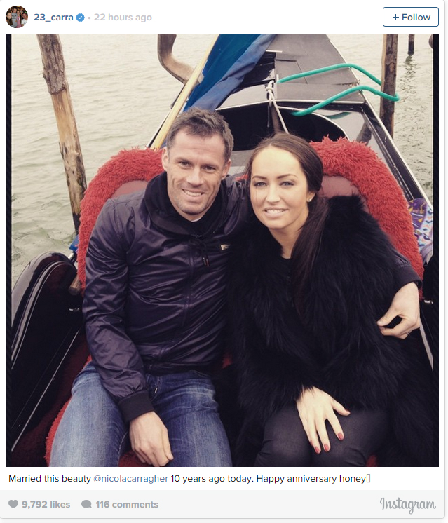 "Menikah perempuan yang cantik ini nicolacarragher 10 tahun yang lalu hari ini. Selamat ulang tahun pernikahan sayang." Tulis Carragher.