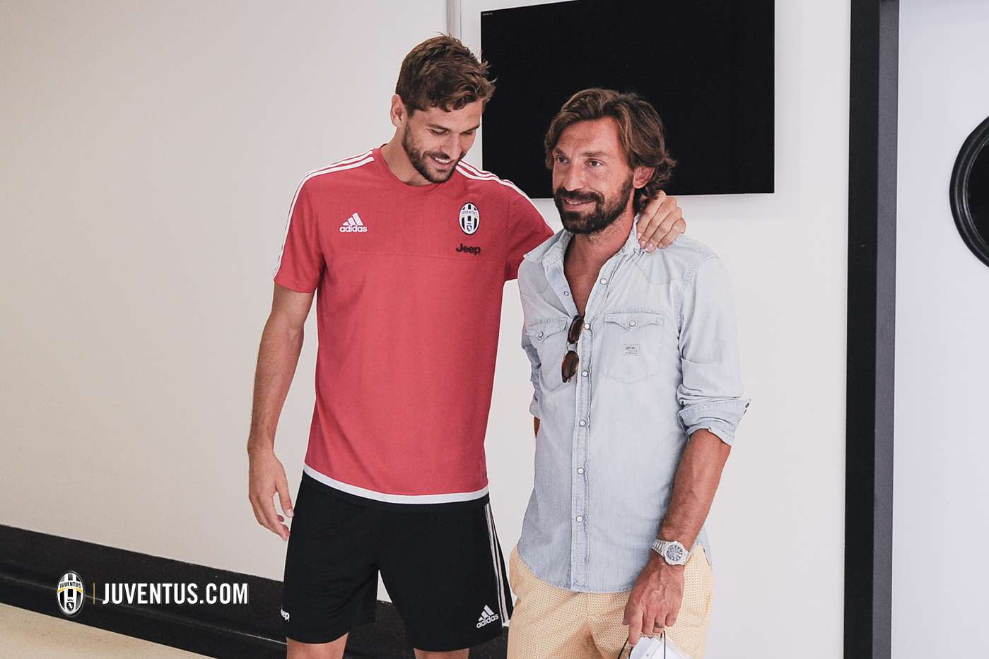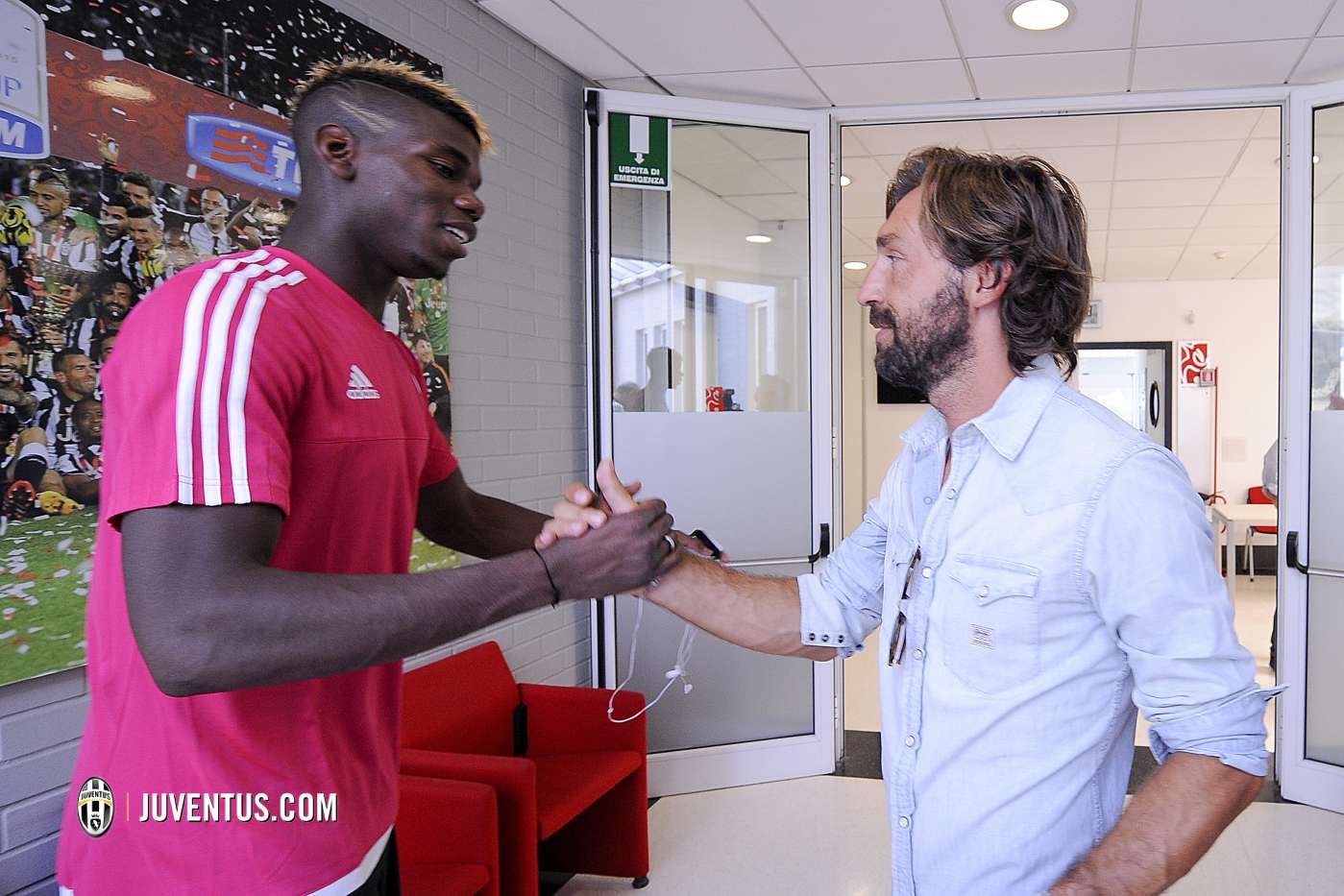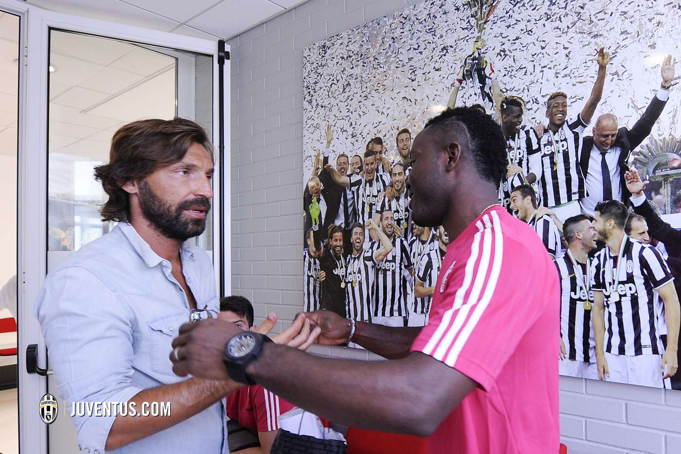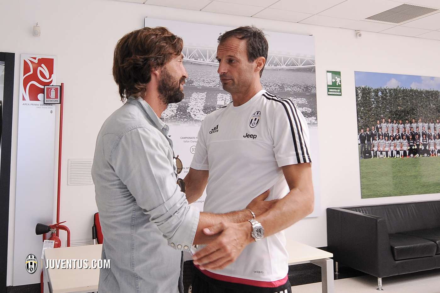 Pemain 35 tahun bertemu dengan beberapa pemain Juventus seperti Paul Pogba, Patrice Evra, Fernando Llorente, dan pelatih Max Allegri. Pirlo tampak bersalaman dengan mantan rekannya dan senyum lebar terpancar dari wajah para pemain serta pelatih Juve.