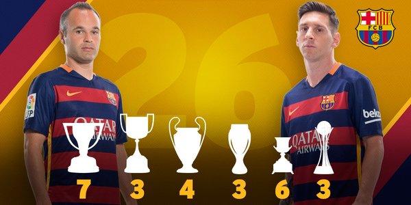 Messi dan Iniesta menjadi dua pemain yang meraih gelar terbanyak di skuat Barcelona. Gelar Piala Dunia Antarklub 2015 yang baru saja diraih usai mengalahkan River Plate 3-0 menjadi gelar terbaru yang berhasil diraih kedua pemain bersama El barca tahun ini.
