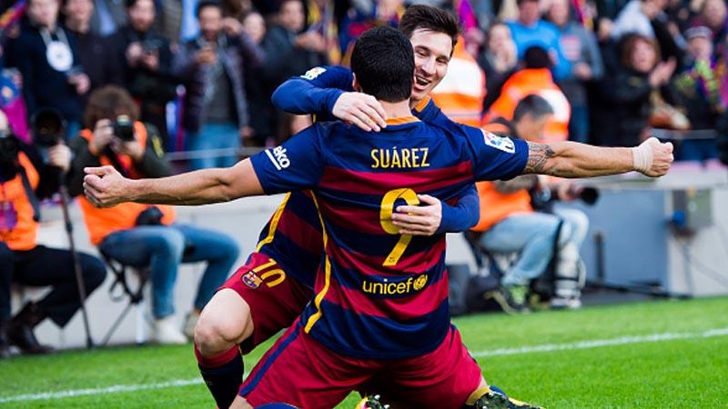 Dua pencetak gol Barcelona, Luis Suarez dan Lionel Messi melakukan selebrasi bersama.