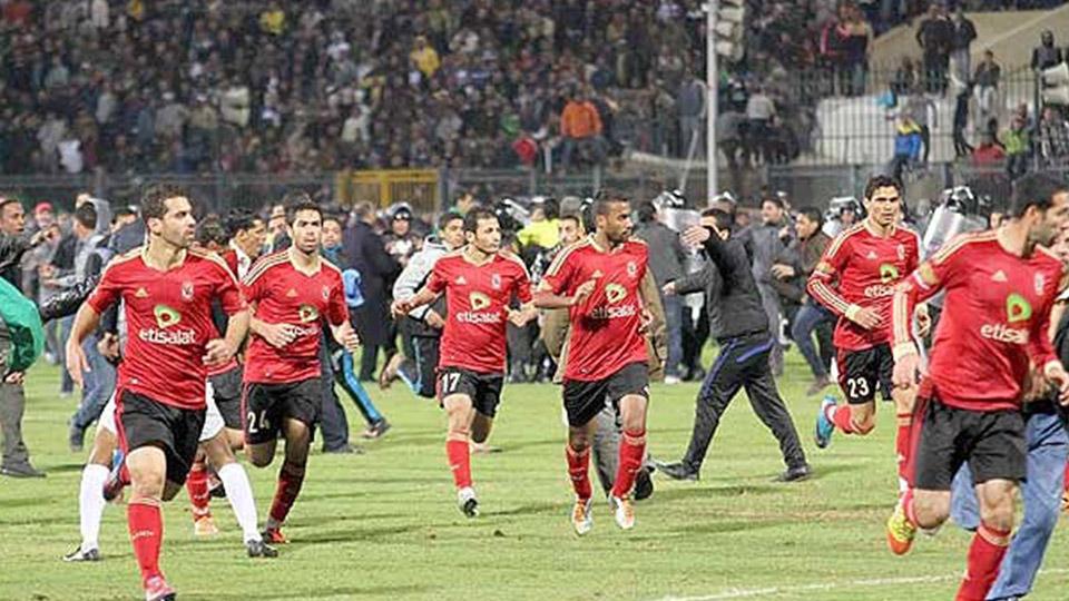 Pemain Al Ahly berlarian menuju ruang ganti demi menghindari amukan pendukung tim tuan rumah.