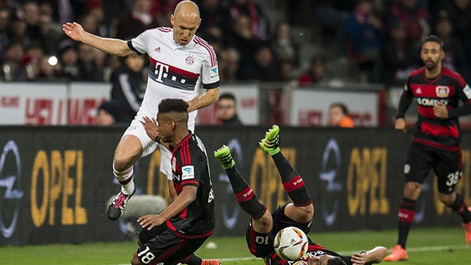 Aksi Arjen Robben saat menghindari hadangan dari dua pemain Bayer Leverkusen.