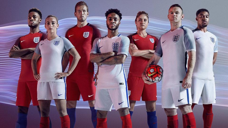 Josh Onomah, Toni Duggan, Harry Kane, Raheem Sterling, Steph Houghton, Wayne Rooney, dan Jordon Ibe berpose bersama dalam balutan jersey home dan away buatan brand apparel Nike ini.