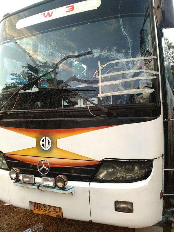 Bus rombongan Aremania yang diserang sekelompok suporter yang diduga Bonek di Sragen, 19 Desember 2015