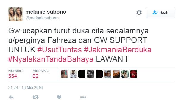 Hal tersebut pun mendapat tanggapan yang cukup serius oleh salah seorang artis sekaligus presenter cantik, Melanie Subono. Wanita kelahiran 20 Oktober 1976 tersebut mengaku sangat mengecam tindakan oknum yang diduga polisi tersebut terhadap Fahreza.