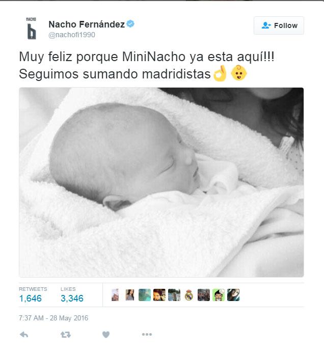 “Sangat senang karena MiniNacho sudah berada sini!!! Kami sudah menambah madridista baru,” kata Nacho lewat Twitter sembari mengunggah foto anaknya.