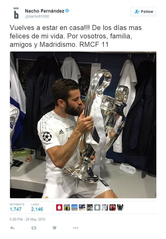 Lewat akun Twitter pribadinya @nachofi1990, Nacho mengungkapkan suka citanya. Ternyata, bayinya tersebut lahir sebelum laga final melawan Atletico Madrid yang berlangsung di San Siro, Milan.