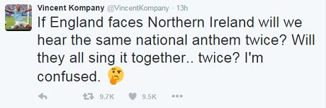 Melalui akun Twitter pribadinya, Kompany mmengungkapkan kebingungannya. Lagu kebangsaan tersebut akan dinyanyikan hanya sekali atau dua kali, jika Irlandia Utara dan Inggris bertemu.