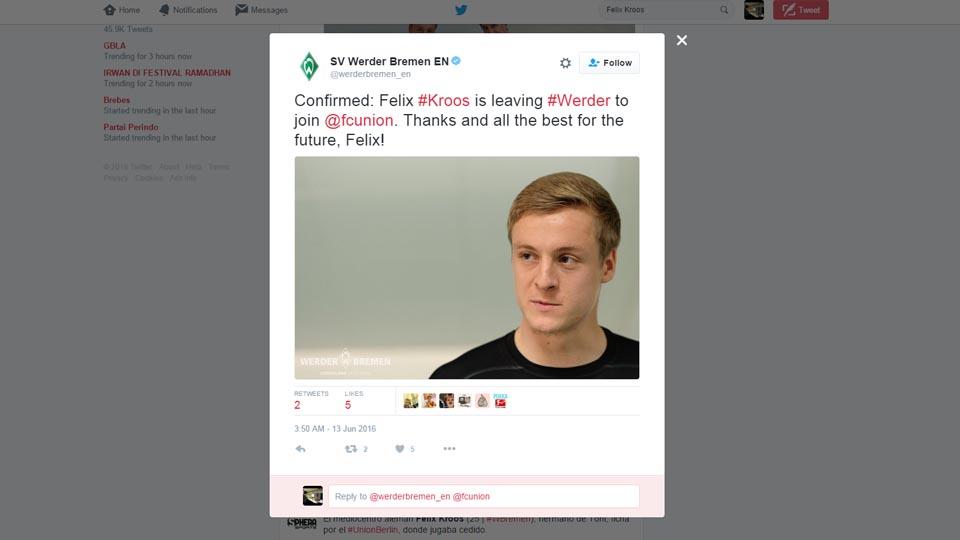 Bintang Werder Bremen, Felix Kroos memutuskan hengkang dari kasta pertama liga Jerman, Bundesliga. Kroos memutuskan untuk melanjutkan kariernya bersama Union Berlin.