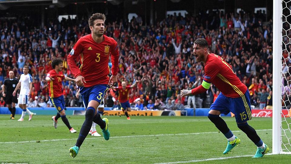 Sergio Ramos naik ke atas punggung Gerard Pique saat merayakan gol ke gawang Republik Ceko