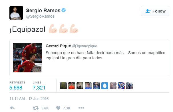 Postingan foto selebrasi berdua yang diunggah Pique di Twitter, langsung ditimpali bek andalan Real Madrid itu dengan kalimat penyemangat: “¡Equipazo!” yang artinya “tim besar”. Tak lupa juga Ramos menyertakan emoticon kepalan tangan sebagai tanda kerja keras.