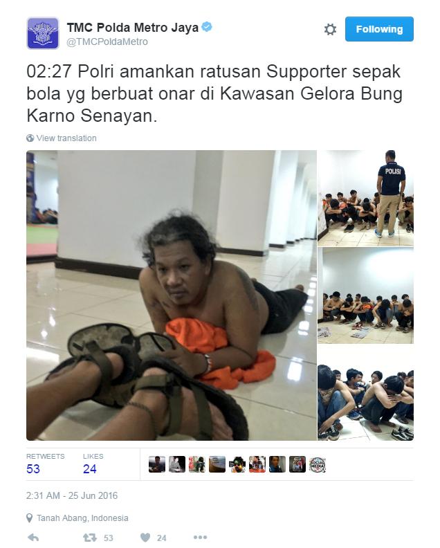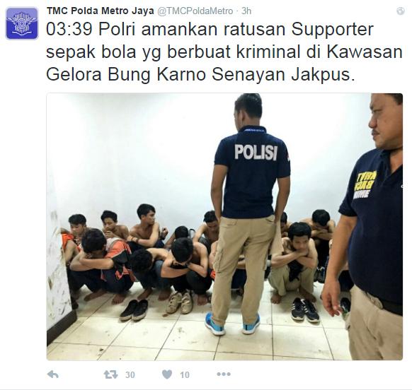 Tindakan itu diambil menyusul bentrok yang terjadi saat laga Persija melawan Sriwijaya di stadion GBK. Aparat kepolisian berhasil mengamankan ratusan Jakmania yang bertindak kriminal dan diduga terlibat dalam kericuhan.