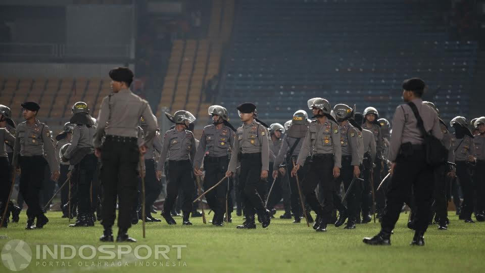 Tampak ratusan suporter Persija Jakarta, The Jakmania, merangsek ke dalam stadion dan terjadi kejar-kejaran dengan polisi. Tak hanya itu, para Jakmania juga merusak papan iklan yang berada di pinggir lapangan.