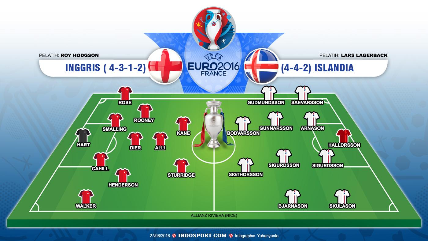 Wayne Rooney yang didaulat menjadi kapten tim kemungkinan besar akan kembali masuk dalam starting XI yang diusung Hodgson dalam laga kontra Islandia. Top scorer sepanjang masa Inggris tersebut akan bermain sebagai gelandang tengah bersama Eric Dier dan Jordan Henderson.