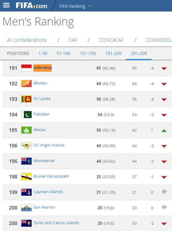 Saat ini negara dengan warna bendera merah dan putih tersebut merosot ke posisi 191 atau turun empat peringkat setelah sebelumnya berada di posisi 187. Catatan saat ini jadi yang paling terburuk sepenjang masuknya Indonesia sebagai anggota FIFA.