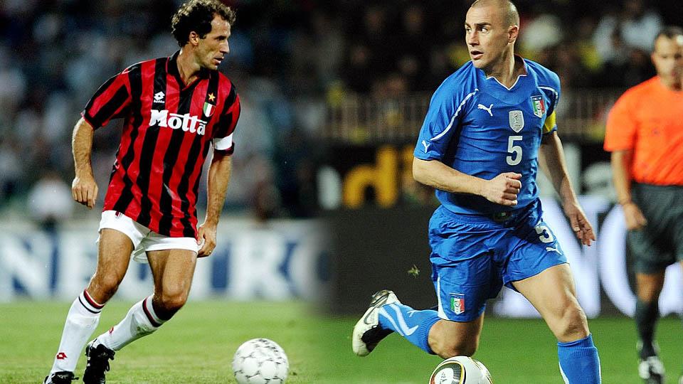 Franco Baresi (kiri) dan Fabio Cannavaro, dua bek legenda Italia.