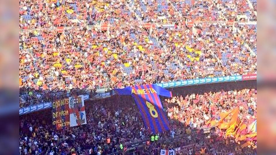 Jersey raksasa nomor punggung 8 milik Andres Iniesta terbentang di Camp Nou