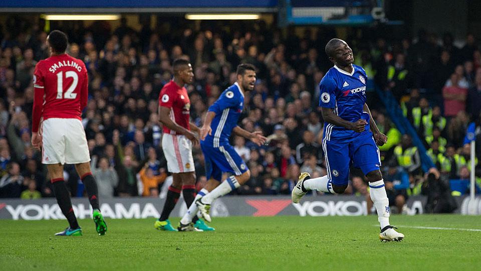 N'Golo Kante (kanan) melakukan selebrasi usai mencetak gol ke gawang Manchester United.
