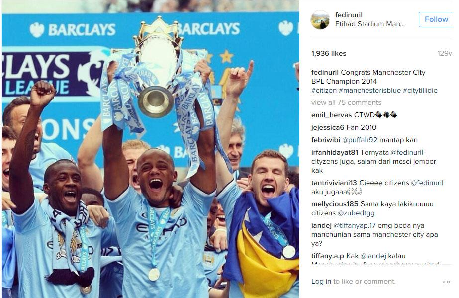 Postingan Fedi Nuril di Instagram pribadinya yang mengucapkan selamat kepada Manchester City usai menjadi juara Liga Primer Inggris 2013/14.