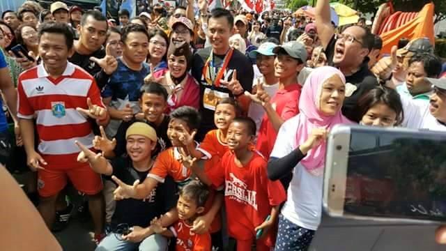 Calon Gubernur DKI Jakarta, Agus Harimurti Yudhoyono bersama pendukung Persija Jakarta.Putra Susilo Bambang Yudhoyono itu pun menekankan dirinya sangat menggemari segala macam hal terkait olahraga. Dia menilai bidang olahraga, tidak terkecuali sepakbola, akan menyatukan masyarakat dalam semangat yang sportif.