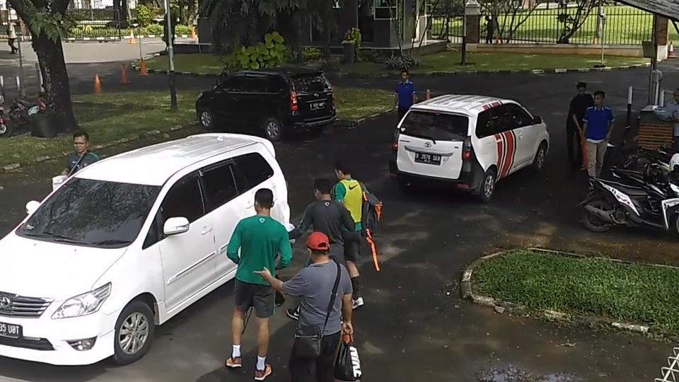 Irfan Bachdim (kanan) dituntun menuju ke dalam mobil untuk mendapatkan perawatan lebih lanjut di rumah sakit.