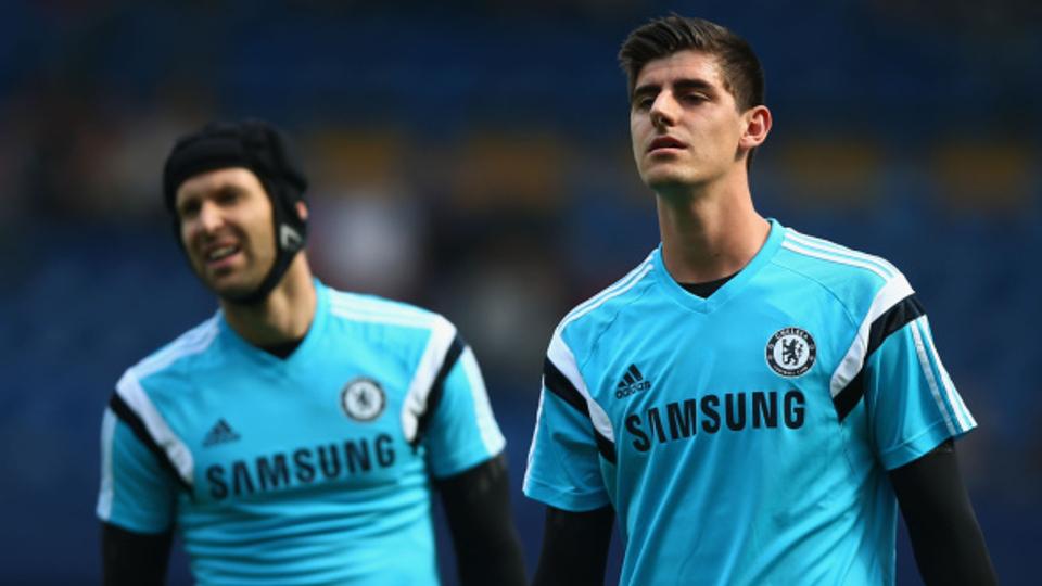 Thibaut Courtois (kanan) dan Petr Cech saat sama-sama berada di Chelsea pada musim 2014/15 lalu.