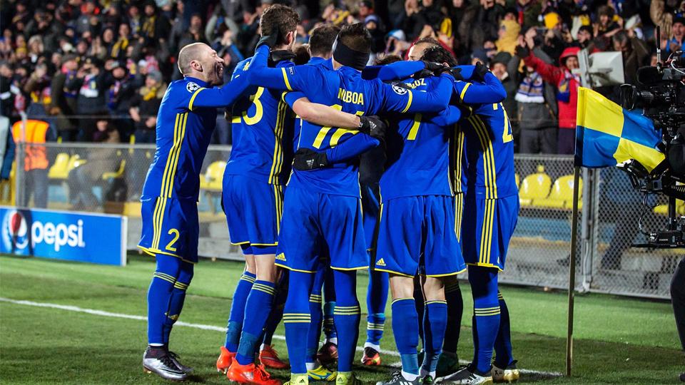 Para pemain FC Rostov berselebrasi usai mengungguli Bayern Munchen.