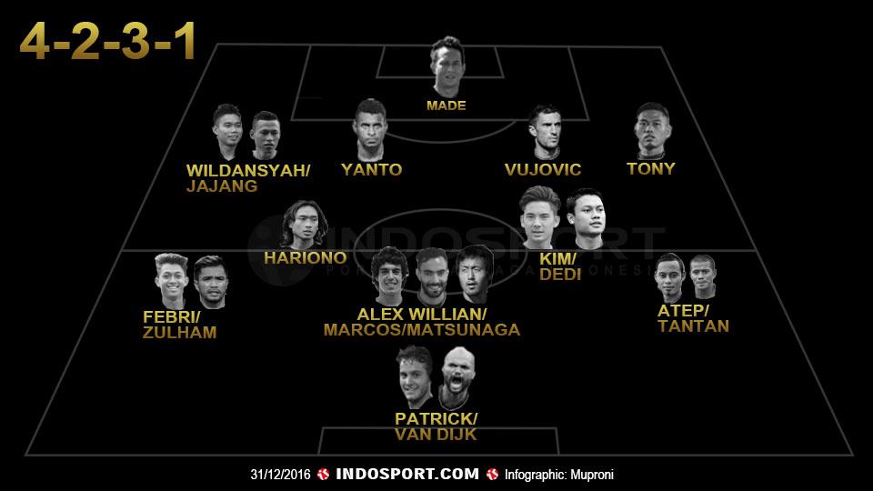 Gelandang bertahan akan ditempatkan Hariono, dan Kim Jeffrey Kurniawan atau Dedi Kusnandar. Febri atau Zulham Zamrun akan mengisi gelandang sayap kanan.