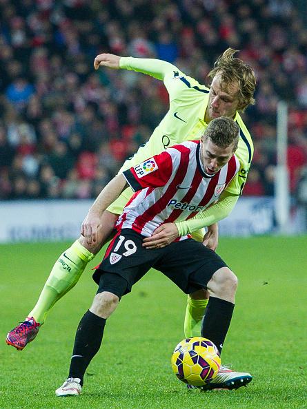 Ivan Rakitic berusaha rebut bola dari kaki Iker Muniain.
